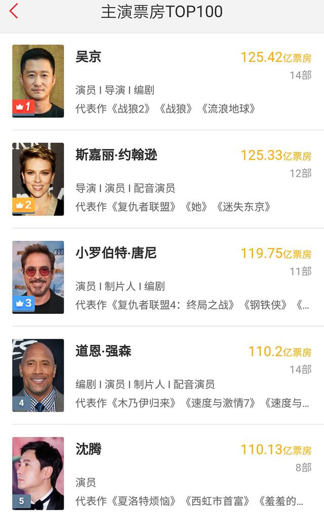 确实,自从今年《流浪地球》横扫春节档之后,该片不仅开启了中国科幻电影的大门,同时也助力主演吴京进入了内地百亿影人的行列中,只比排在第一位的斯嘉丽·约翰逊差2.81亿。而随着《我和我的祖国》和《攀登者》的首映票房出炉,吴京以125.42亿的成绩完成了超越,排在了百亿影人第一名。