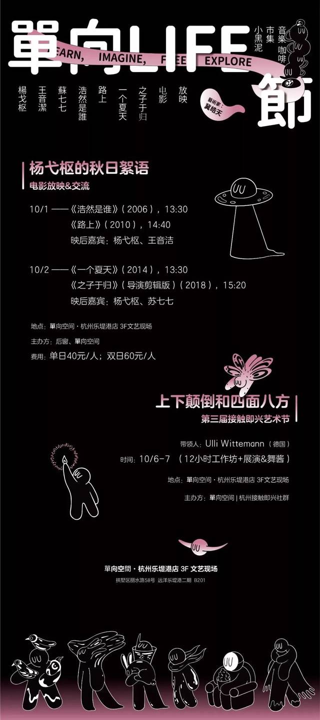 10 月 1 日-10 月 7 日,我们在杭州举办首届单向 LIFE 节,从一家书店出发,以好书好物为载体,以展览、市集、主题分享、音乐现场、电影放映、舞蹈工作坊等多种形式,思索智性生活的多种可能。(详见:这家不务正业的书店又在搞些啥? | 首届单向 LIFE 节 )