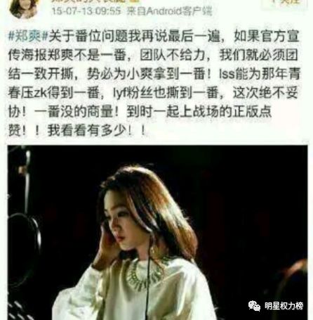 说15年的时候,郑爽粉丝那边就已经带话题表示如果宣传海报郑爽不是一番,团队不给力,她们就必须团结一致开撕。
