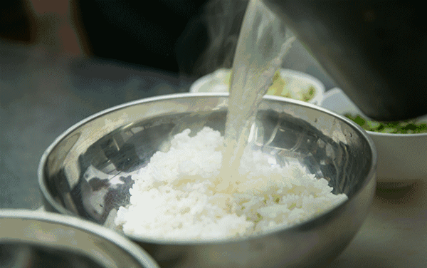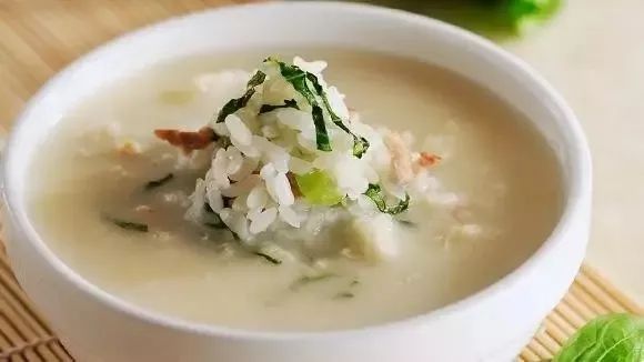 隔天的米,一锅水烧开,饭入水,等水滚开一分钟再把冷饭团搅开,米粒还没开花,水汤泛起淡淡的米色,过一份斜桥榨菜,嗲!