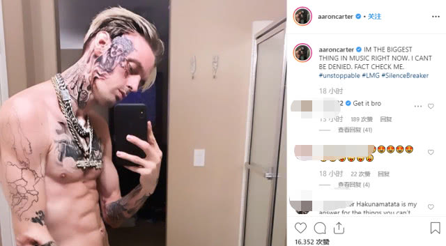 9月28日,31岁美国歌手亚伦·卡特(Aaron Carter)在社交平台上晒出了自己面部的刺青,带着自信的语气表示:“我在音乐里是王者,无法否认我,承认事实吧。”