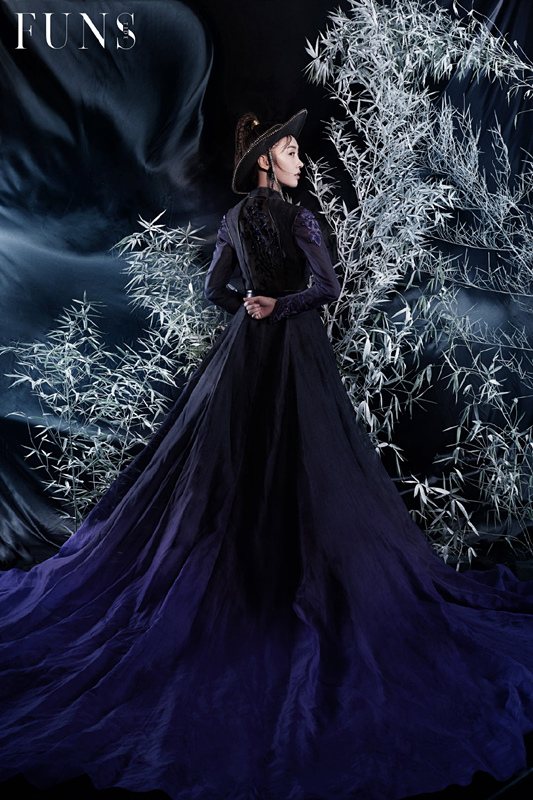 宣璐身着一袭炫酷的墨蓝色长裙,头戴侠女斗笠帽,藏身于竹林暗影之中。身材好颜值高,表现力满分的宣璐真是什么造型都能轻松驾驭。