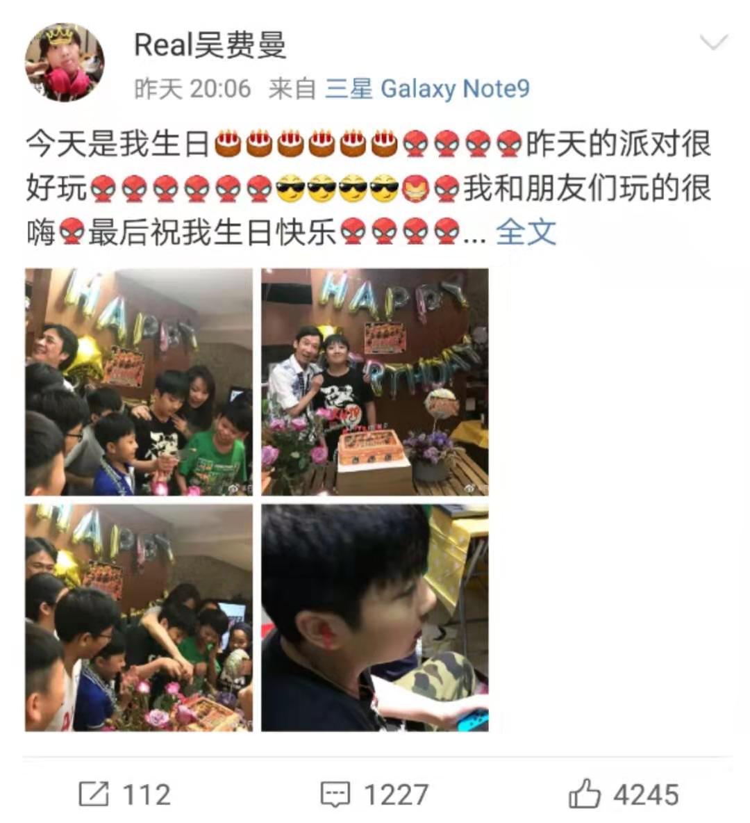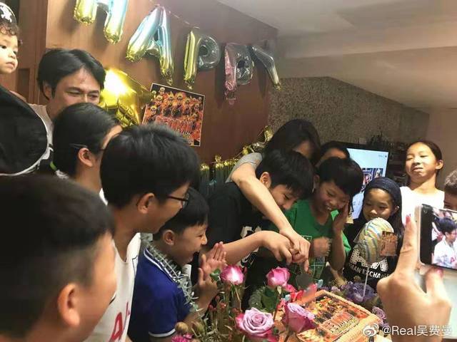 照片中,费曼穿着黑色短袖,被一群年龄相近的伙伴围绕在中间,手里拿着切蛋糕的小刀,而极少现身的妈妈王丽萍这次也陪伴在他的身边。