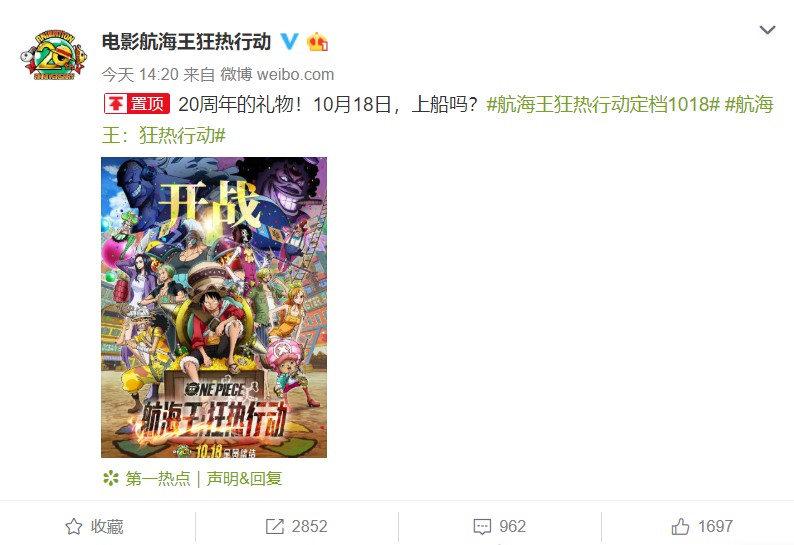 而在9月24日,《航海王》20周年剧场版《航海王:狂热行动》开通了官方微博,并发布首条微博宣布引进内地,引发粉丝的期待和狂欢,只是没想到定档的日期来得如此快。