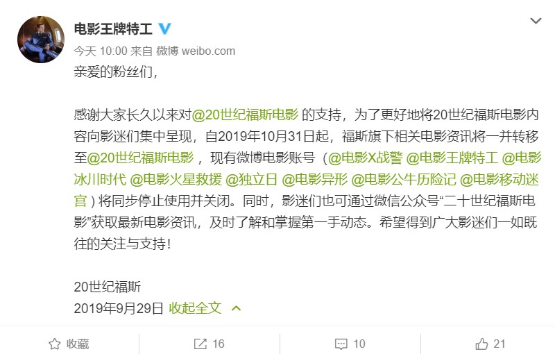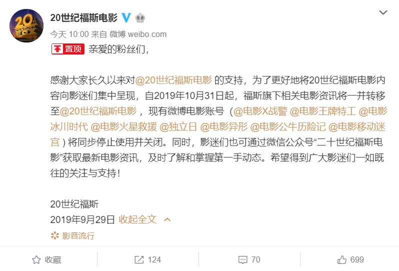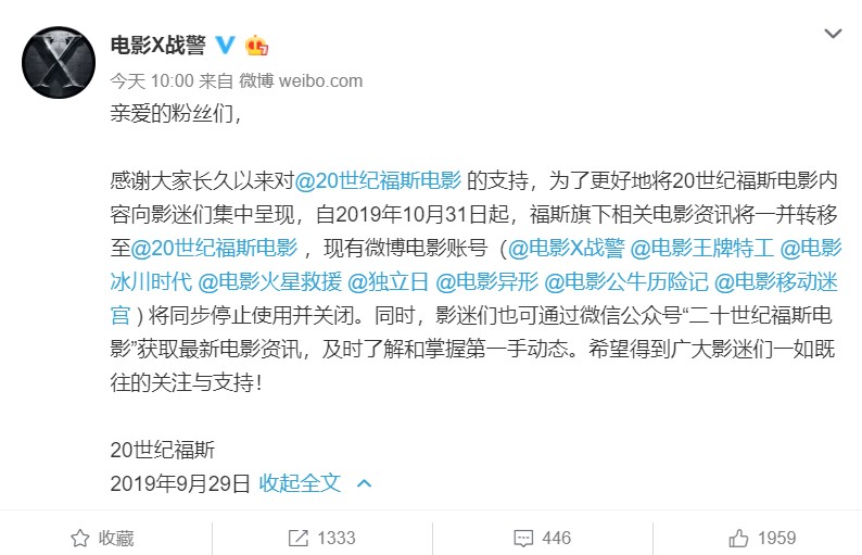 并宣布,自2019年10月31日起,福斯旗下相关电影资讯将一并转移至20世纪福斯电影官微。
