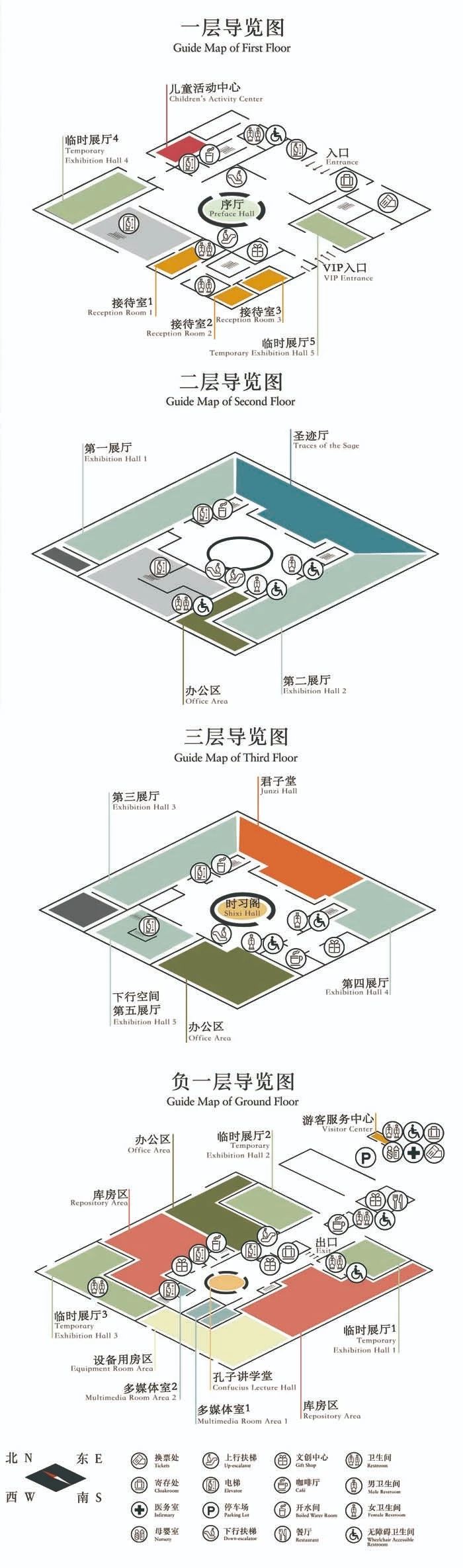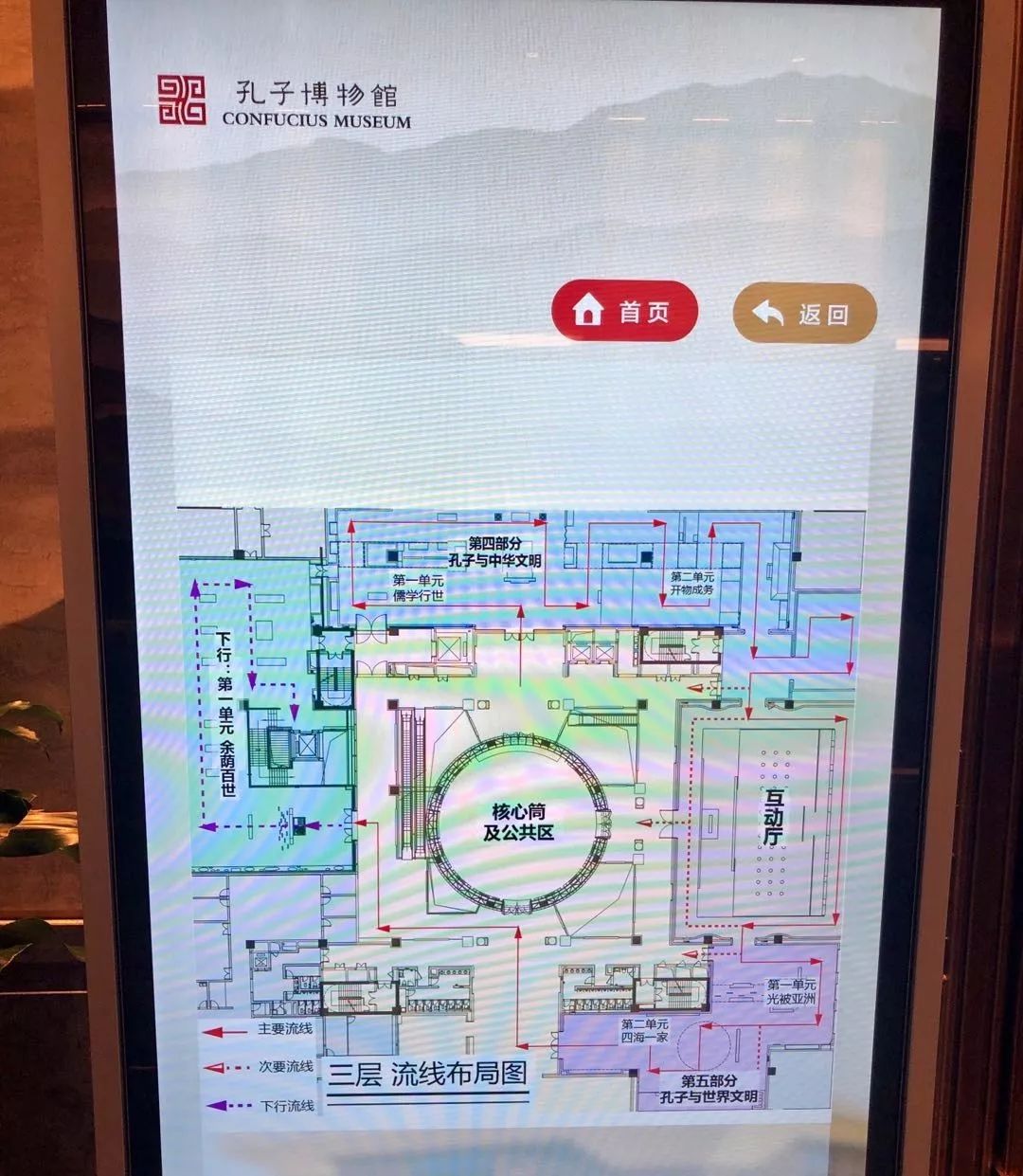 据介绍,总建筑面积5.5万平方米,展陈面积1.7万平方米,巨大、陌生的参观空间对观众而言,难免会产生焦虑心理。孔博的导览指示标都设置的恰到好处,既不喧宾夺主,又能够有效的给予观众提示。游客服务中心以及官网中都设有博物馆楼层导览图,方位、出入口及各区域都用不同颜色标注的十分详细。此外在展厅外,还设有多媒体导览显示屏,点击想要参观的楼层,即可查看楼层各区域的信息。与导览图有所区别的是,多媒体导览显示屏还标注了楼层的流线布局,在有展厅的楼层更是设置了“主要流线”“次要流线”“下行流线”三个导览路线,能够满足观众多种参观需求,也让博物馆公共服务理念深入人心。