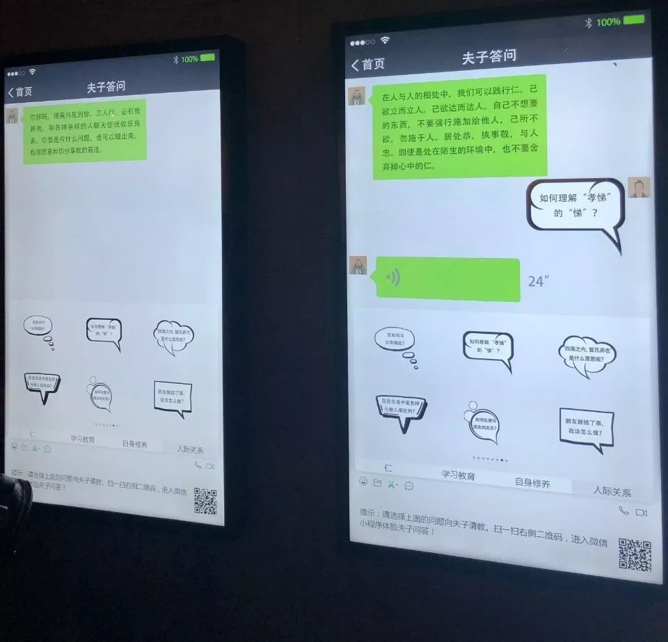其次,展厅中随处可见展现孔子历史故事的雕塑装置,场景性搭配可视性的方式便于观众理解与“对话”。再利用多媒体、智能移动终端等手段,融入游戏、“夫子问答”等交互、虚拟体验设计,使观众不再仅仅看文物,取而代之的是沉浸于情景的亲身体验,进而对儒家思想有了更加生动、立体、直观的理解。