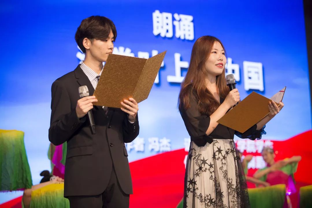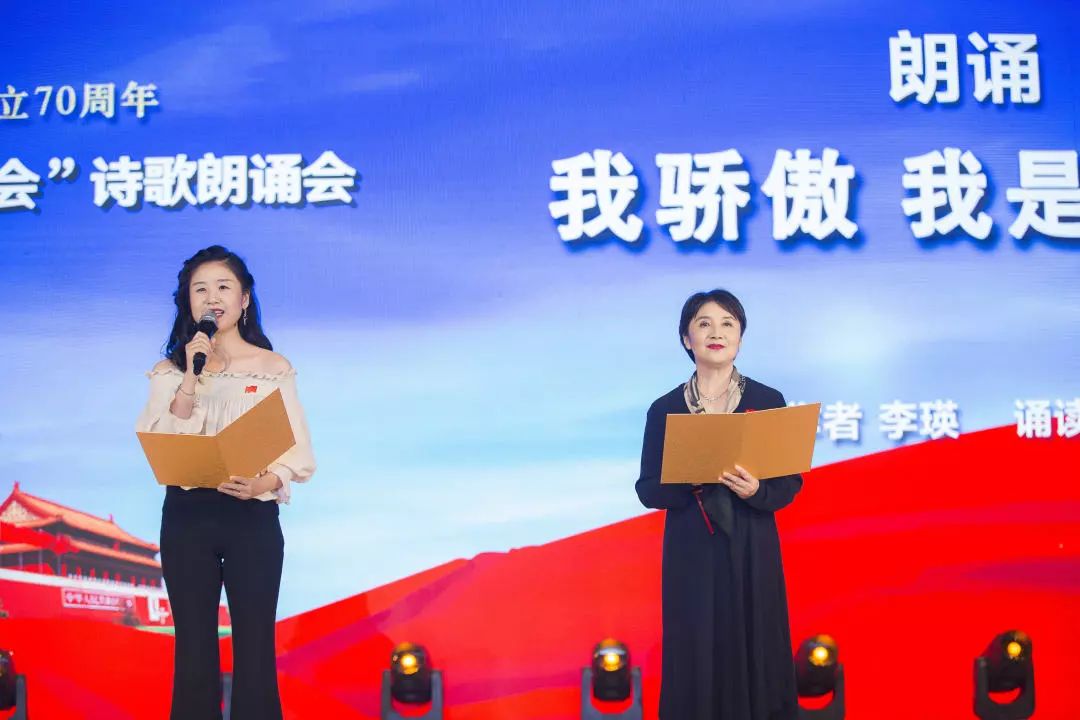 在《我和我的祖国》的合唱声中,朗诵会拉开帷幕。活动现场流光溢彩,歌声与朗诵声相互交织,共同歌颂新中国波澜壮阔的70年。
