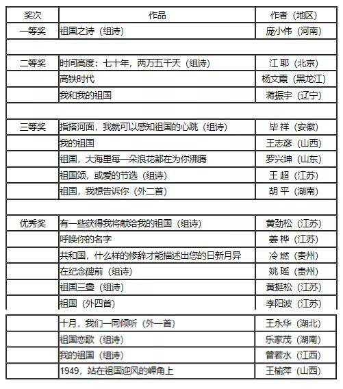 “祖国颂”——庆祝中华人民共和国成立70周年诗歌大赛评奖结果也在本次活动中揭晓。大赛于2019年2月发布启事,面向国内外作者广泛征稿,7月30日截稿时共收到参赛稿件1400余件,约5000余首诗歌。经过严格的初评、终评,最终评出一等奖1名、二等奖3名、三等奖5名、优秀奖10名。获奖作品名单如下: