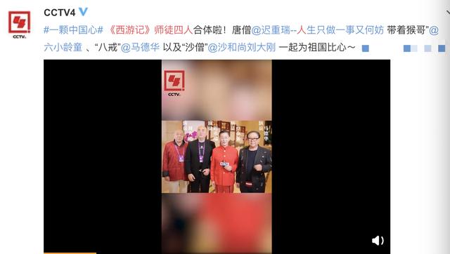 近日中央四套官博发出了一段视频。视频内容是86版《西游记》师徒四人的扮演者,马德华,六小龄童,迟重瑞,刘大刚合体为祖国母亲庆生的视频。他们表示,在国庆七十周年之际,祝愿我们伟大的祖国繁荣昌盛,我爱我的祖国,我有一颗中国心!