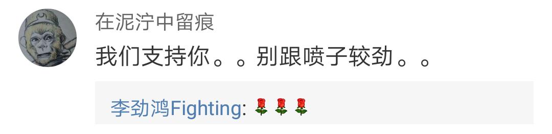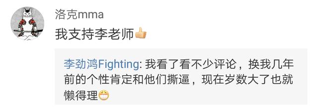对此,拳迷们纷纷留言力挺道:“你这个口才真的! 霸气又有特么点道理。我二天多跟你学哈”、“我支持李老师”、“我们支持你,别跟喷子较劲”、“骂得好。走自己的路,凭本事获得的。也没吃喷子米和面的。”、“有些人总是见不得别人好,说别人越缺什么就越炫耀什么,就算是这样,那也得有这个能力资本炫耀出来!把自己做好就是最好的。”