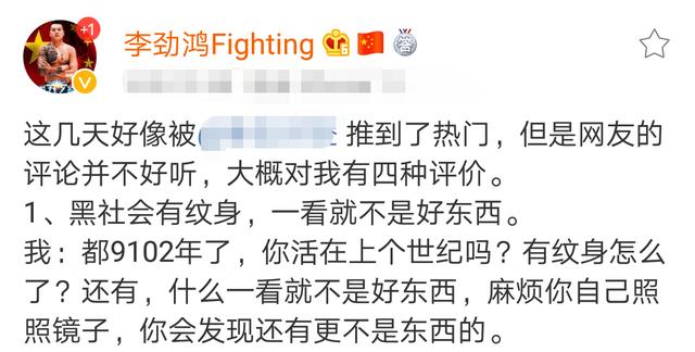 李劲鸿通过社交平台写到:“这几天好像被搏击自媒体推到了热门,但是网友的评论并不好听,大概对我有四种评价。1、黑社会有纹身,一看就不是好东西。我:都9102年了,你活在上个世纪吗?有纹身怎么了?还有,什么一看就不是好东西,麻烦你自己照照镜子,你会发现还有更不是东西的。2、20岁就出卖肉体和灵魂赚钱,这种人太可怕了。我:说到出卖肉体和灵魂你就能联想到那么龌龊黑暗的事,你内心是有多悲哀。在我眼里里面,搬砖也是出卖肉体和灵魂,因为我不喜欢搬砖但是为了生活不得不搬。”