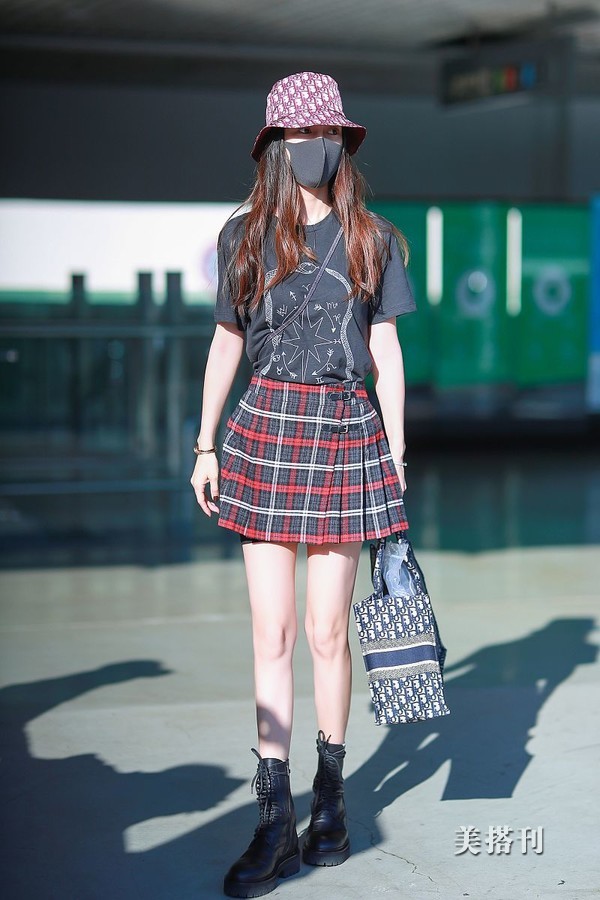 Baby在外套里面搭了一件灰色的印花修身t恤,卡通印花十分减龄,搭红黑格纹百褶裙甜美又可爱,露一双白皙美腿很吸睛。搭配的黑色靴子增添一份朋克帅气感。她长发飘飘灵气十足,特别元气。