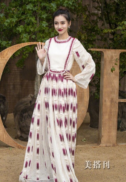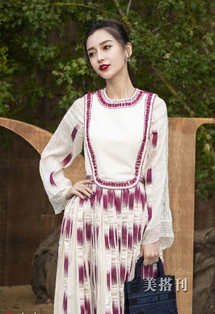 参加巴黎时装周的baby身穿一件红白迎接礼服,设计非常有复古英伦风,细条纹视觉上更加显瘦,收腰设计显出完美身材比例,简单的红白拼接也是大气十足。Baby的妆容和发型上也没有过多的心思,高丸子头的发型更显出精致五官,额前碎发增添少女气息,配上大红唇也不觉得有什么距离感,反而多了一份俏皮。