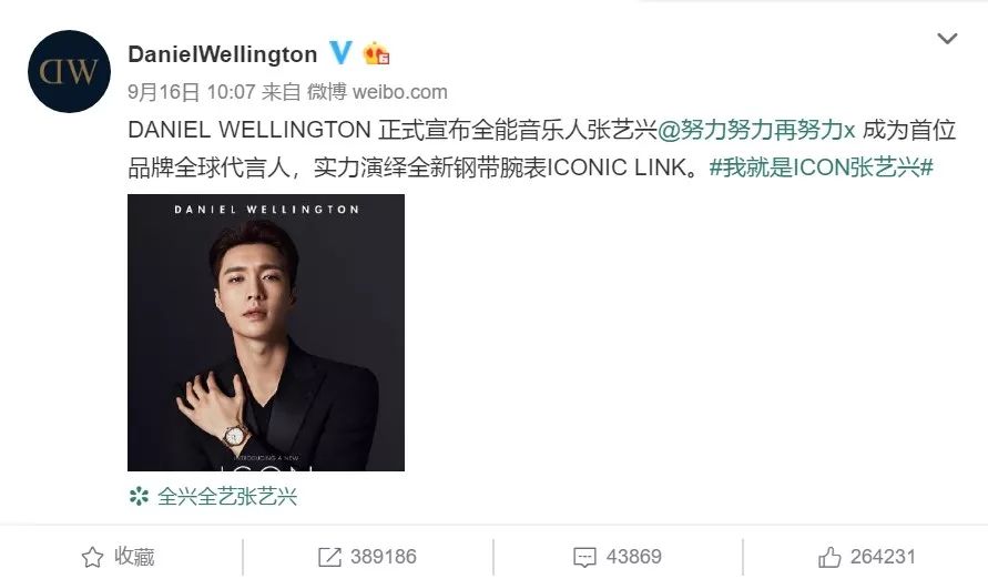 另一方面,以DANIEL WELLINGTON为代表的国际大牌在其全球官网、推特、Ins、脸书、微博均官宣发布代言信息,给予张艺兴绝对宠爱和前所未有的重视,让“全球代言”名副其实。