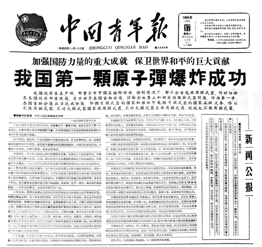图为中国青年报《我国第一颗原子弹爆炸成功》报道