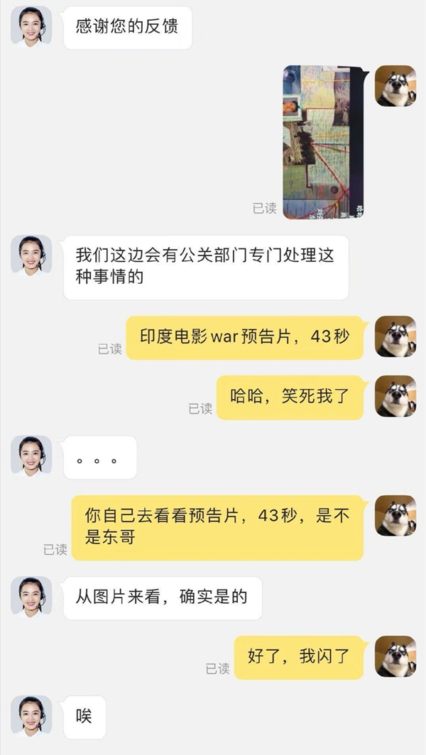 如此暗搓搓却又明显的导向,显然印度电影片方就是故意在针对刘强东案件大做文章,而网友也在之后联系到了刘强东公司的客服,并告知客服相关内容,而从对话内容来看,客服的回应也是相当的真实,从一开始的略显无语到后来突然有感而发“唉”字,看后也是让人想笑。