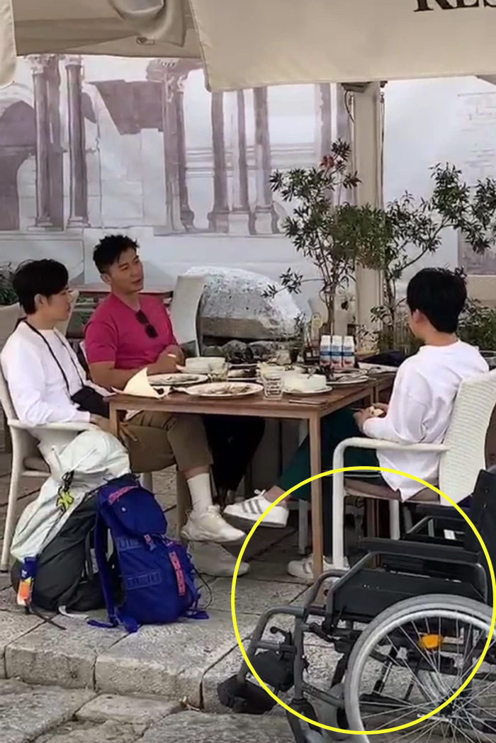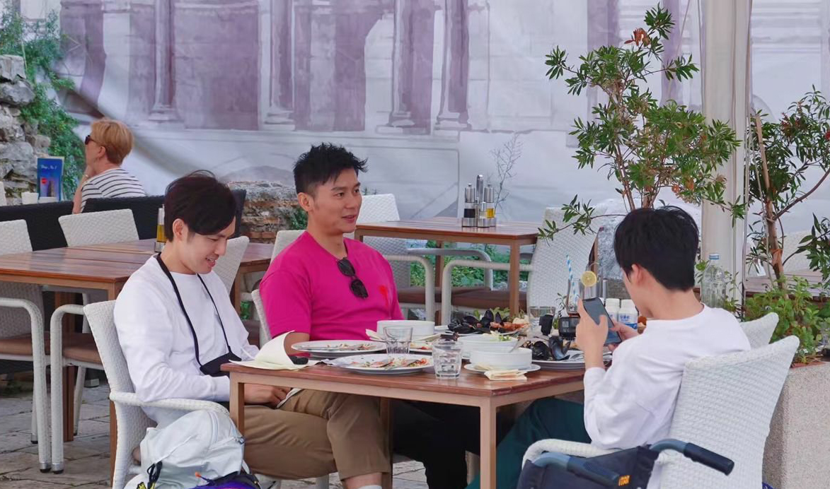 不知道大家注意到没有,在三人吃饭的桌子旁边,出现了一辆轮椅,原来李晨在拍摄过程中不慎受伤,影响到了行走,只能借助轮椅出行。郭麒麟在后面默默帮他推轮椅,也是个很暖心的小伙子~