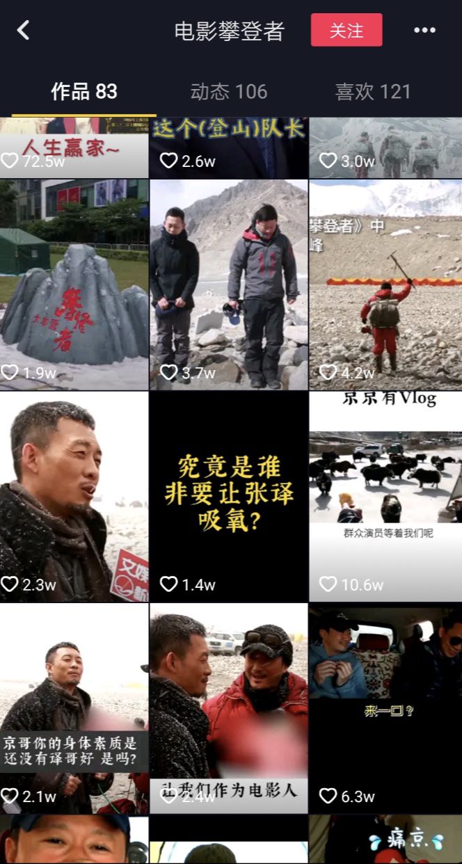 不过,《攀登者》虽然没有进行地毯式和病毒式营销,但是其在抖音上释放幕后花絮的频率却相当频繁,视频中可以看出整个拍摄过程相当艰苦,不少演员也冒着生命危险付出了许多心血,完全可以集结成一部幕后纪实了。 这些“内容向”的宣传方式优势在于,虽然前期声量不是很大,但一旦影片前期口碑大爆,那么这些花絮就将成为助推路人缘的最佳素材,反哺票房。
