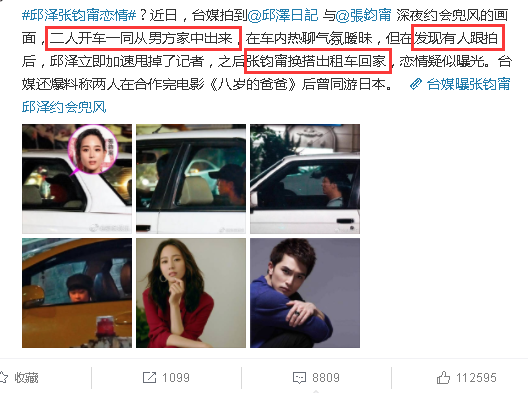 从媒体报道中我们可以看到,当天“二人开车一同从男方家中出来”,随即在车内热聊,气氛相当暧昧,然而发现狗仔跟拍后,邱泽立即甩掉记者,张钧甯被迫换搭出租车回家。