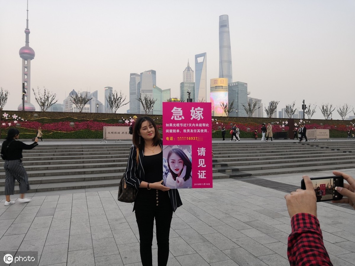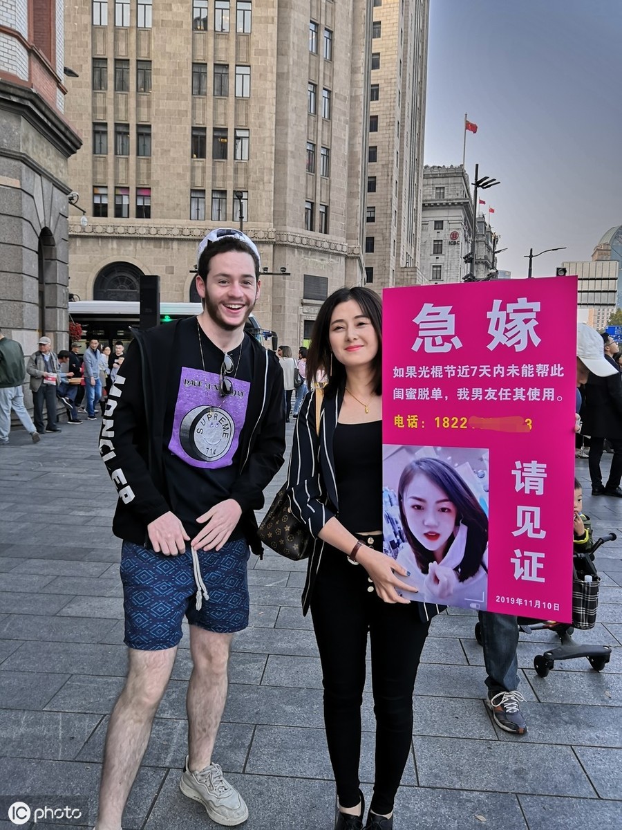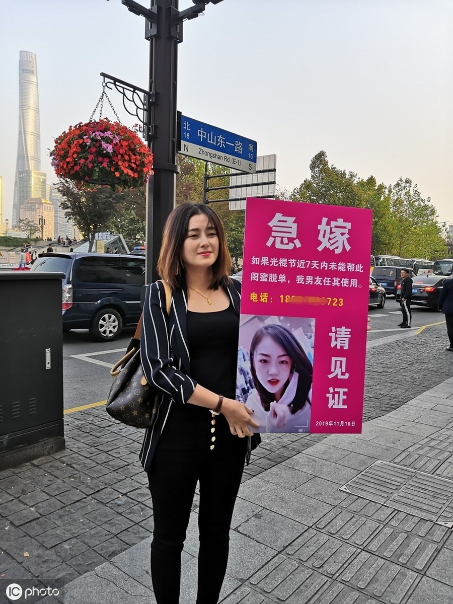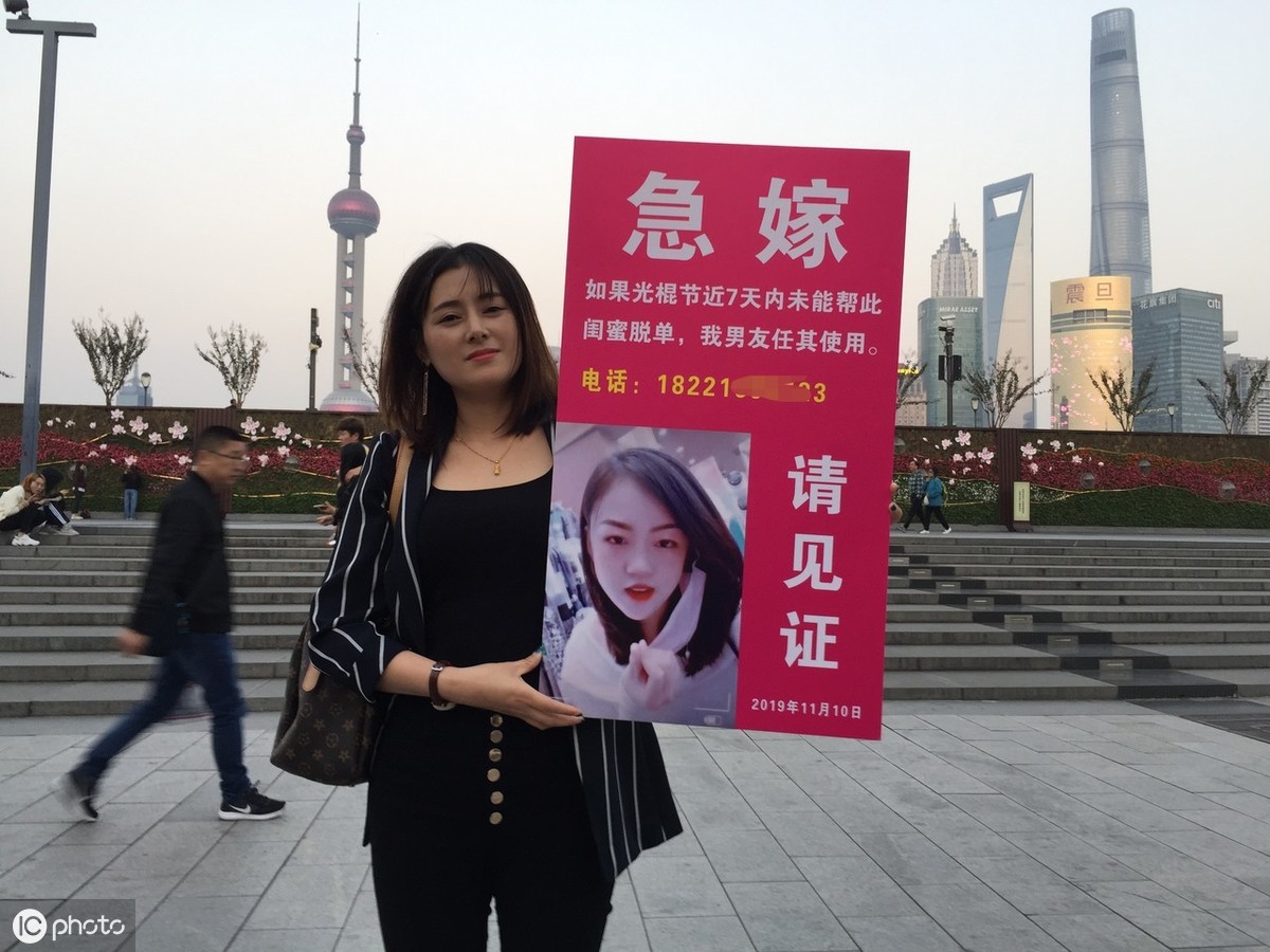 在“光棍节”来临之际,上海外滩观景平台附近,一位气质不凡的靓丽女子,手抱一个“急嫁”小牌子,面向路人请求见证:如果近7天内自己未能帮助漂亮闺蜜成功脱单,自己的男友将任由该闺蜜使用。 今天是一年一度的双十一,也就是所谓的“光棍节”,这不仅是一个网上血拼的网购大节,还是单身男女借机牵手心仪之人的脱单狂欢节,而这位为闺蜜操碎心的上海女子,甚至要献出自己的男友来为好姐妹“救急”。2019年11月10日下午4时许,也就是距光棍节还有8个小时左右时,在繁华的上海外滩观景平台附近,一位气质不凡的黑衣靓丽女子,手抱一个“急嫁”小牌子,面向路人请求见证。牌上书:急嫁——如果光棍节近7天内未能帮此闺蜜脱单,我男友任其使用。上面还喷绘着其闺蜜的特写靓丽头像及一个电话号码。在这个海量信息时代,也许大家平时在手机上刷到的奇闻怪事太多了,这位黑衣靓女的“急嫁秀”看似用心良苦,但并没能吸引到太多人围观和拍摄,只是吸引到数位欧美“老外”即兴合影互动。据悉,该黑衣女子姓许,安徽人,在上海已工作数年的自由职业者。其之所以愿意与闺蜜“共享”自己心爱的男友“任其使用”,是因为她实在不忍心再让闺蜜继续过那夜夜难熬的“冷日子”。对于这种奇葩之举,网友们又会怎么看待呢?