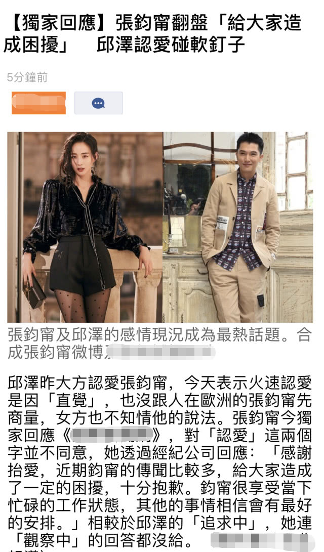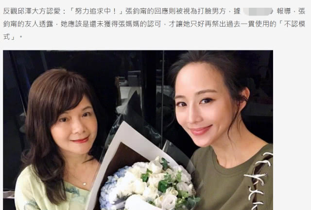 这个报道很有意思,配合了邱泽经纪人的说法,认定张钧甯跟邱泽是恋人,只是女方“太孝顺”,因此才不愿意承认。