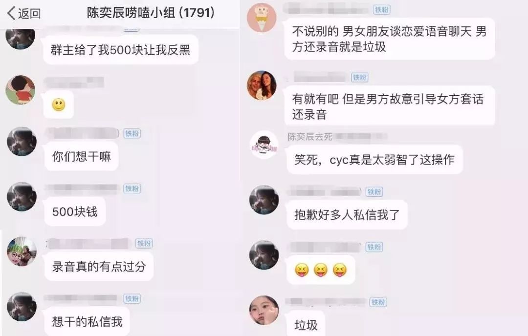 经纪人先是在陈奕辰粉丝群花500块雇粉丝去黑张天,结果偷鸡不成蚀把米让陈奕辰脱粉不少。
