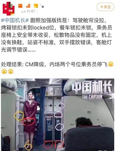 其中一张剧照更是惹起争议,比如有驾驶舱门没关,餐车、餐车门和壁柜锁扣没锁,空姐穿高跟鞋没有换平底鞋等等错误。
