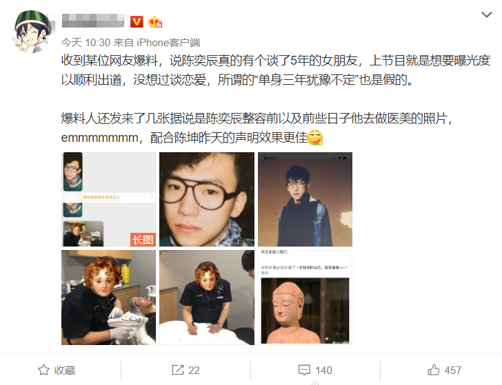 此外,爆料人还放出了陈奕辰整容前照片,以及后续他去医院做医美的现场照片,现在看来,陈奕辰为了出道确实煞费苦心了。