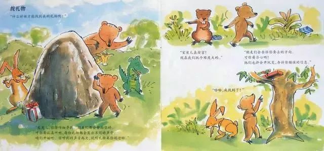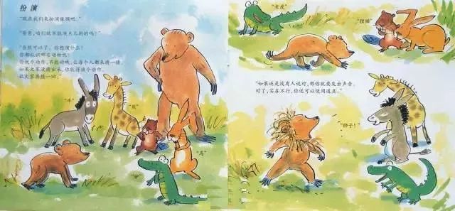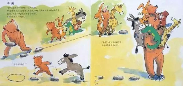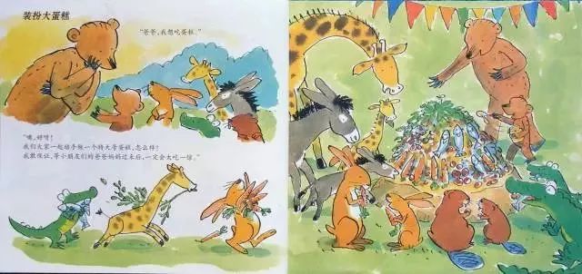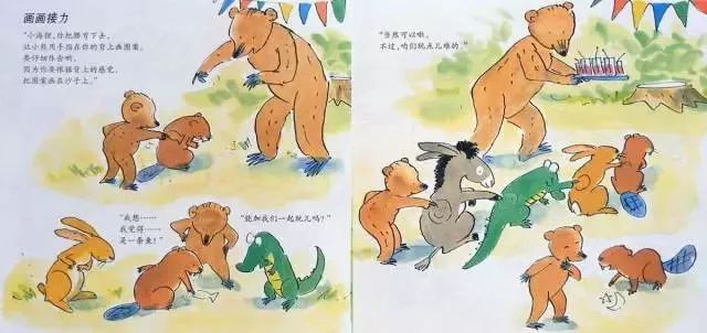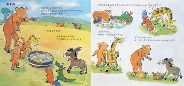 今天分享的绘本故事叫《小熊和最好的爸爸聚会》,小熊所有的朋友都来了,大家一起做游戏:扮演、画画接力、苹果赛、平衡……当然也有很多小插曲:小驴不想玩刺驴,小海狸把大树“变”断了……