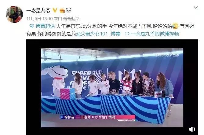 其次,《超新星》助力品牌实现节点借势。节目播出时间恰逢年底营销旺季,品牌在《超新星》中的高频曝光迅速抢占了年底营销旺季的流量高地,节目中各类场景化营销更具差异化,让观众无形中长时间、高频率接收到品牌活动信息,实现密集推广效果,各品牌主借助节目的播出,赚足潜在用户的关注。赛事现场,“11.11京东全球好物节”活动信息直观呈现,迅速扩大受众覆盖面;京东吉祥物小JOY的现场互动,加深观众对品牌的印象,其中京东小JOY与火箭少女101的互动让不少粉丝直呼可爱。