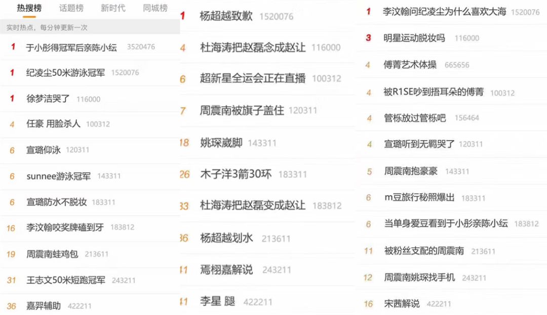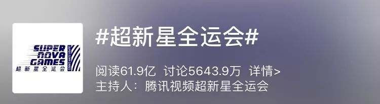 紧张激烈的赛制,镜头直播的临场感,体育竞技与明星娱乐精神在《超新星》中达到了一种高度真实的融合,体育竞技精神与明星娱乐呈现出巨大的观赏性,而这恰恰是最打动粉丝市场的因素。数据显示,截至目前,第二届《超新星》共创造106+全网热搜话题,其中,#超新星全运会#微博话题阅读量61.9亿,讨论量达到5643.9万,赛事直播第三日获得猫眼综艺全网热度冠军,多次占领了抖音、知乎、虎扑、豆瓣等平台热搜。