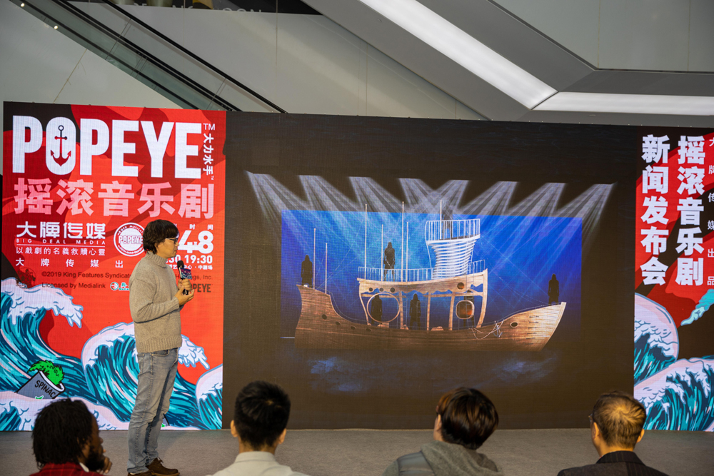 发布会现场首次对外公开了摇滚音乐剧《大力水手》的舞美设计图,舞美设计窦辉讲述舞台上的道具船真实复刻了原版卡通里的船,演员所有的演出都在船上进行,而要把一个重达5吨的“庞然大物”搬上舞台确实下了大“功夫”,如此震撼的场面也只能走进剧场才能感受到。