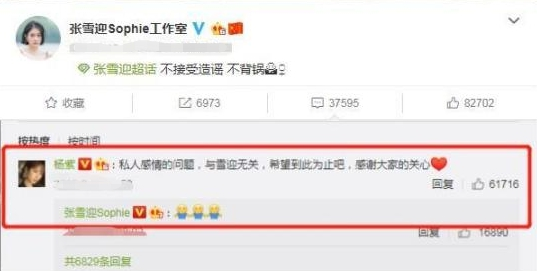 后来张雪迎工作室发博澄清“不接受造谣,不背锅”,杨紫也帮她解释“私人感情的问题,与雪迎无关,希望大家到此为止。”
