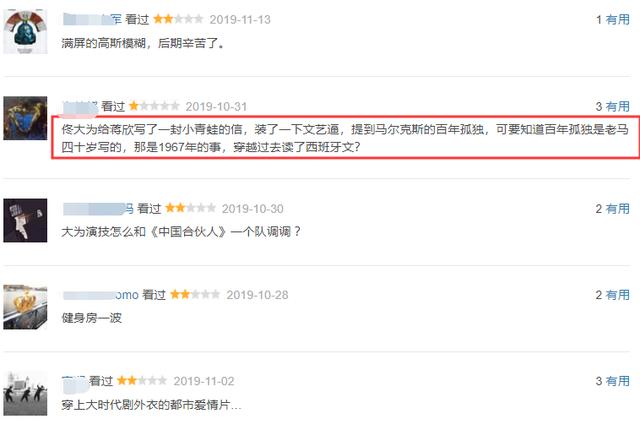 豆瓣上也出现了不少打一星的评论,很多人差评都集中在剧情上,出现了一些不符合逻辑的地方。有一个观众直接点出了这部剧的一个大漏洞:佟大为给蒋欣写了一封小青蛙的信,装了一下文艺,提到马尔克斯的《百年孤独》,可要知道百年孤独是老马四十岁写的,那是1967年的事,穿越过去读了西班牙文?不知道大家怎么看,欢迎发表看法。