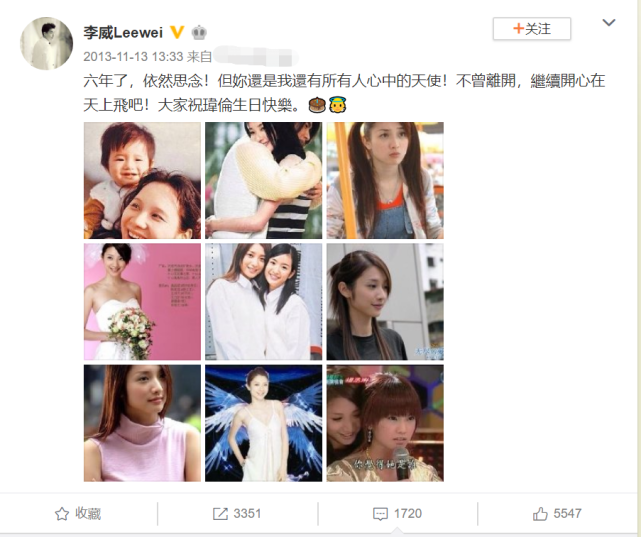 照片中的许玮伦留着长发,笑容灿烂,依旧明媚动人。2017年,李威晒出的是许玮伦单人美照,写道:“生日快乐,天使!10年”翻看李威的微博不难发现,每一年李威都会称呼许玮伦为天使,天使本义是上帝的使者,来自天上的使者,受到上帝的派遣来保护信众,往往代表着圣洁、良善,正直。李威如此称呼许玮伦可见在其眼中的许玮伦是多么美好。或许在李威的心中许玮伦只是换了一种方式守护她的亲人与友人。