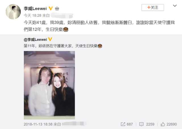 11月13日正是许玮伦41岁冥诞,这一天许玮伦的前男友李威也转发去年为许玮伦“庆生”的微博并写下:“今天你41岁,我39岁,你清丽动人依旧,我发丝渐渐鬓白,谢谢你当天使守护我们第12年,生日快乐!”并配上一个灰色生日蛋糕表情缅怀昔日爱人。这也是李威连续12年悼念许玮伦。
