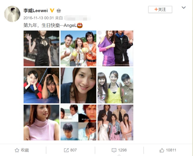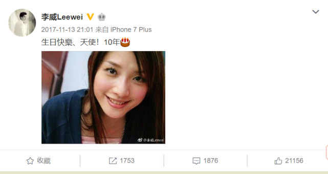 2018年,李威在微博写道:“第十一年,你依然在守护着大家,天使生日快乐!”并晒出两人的亲密合照。