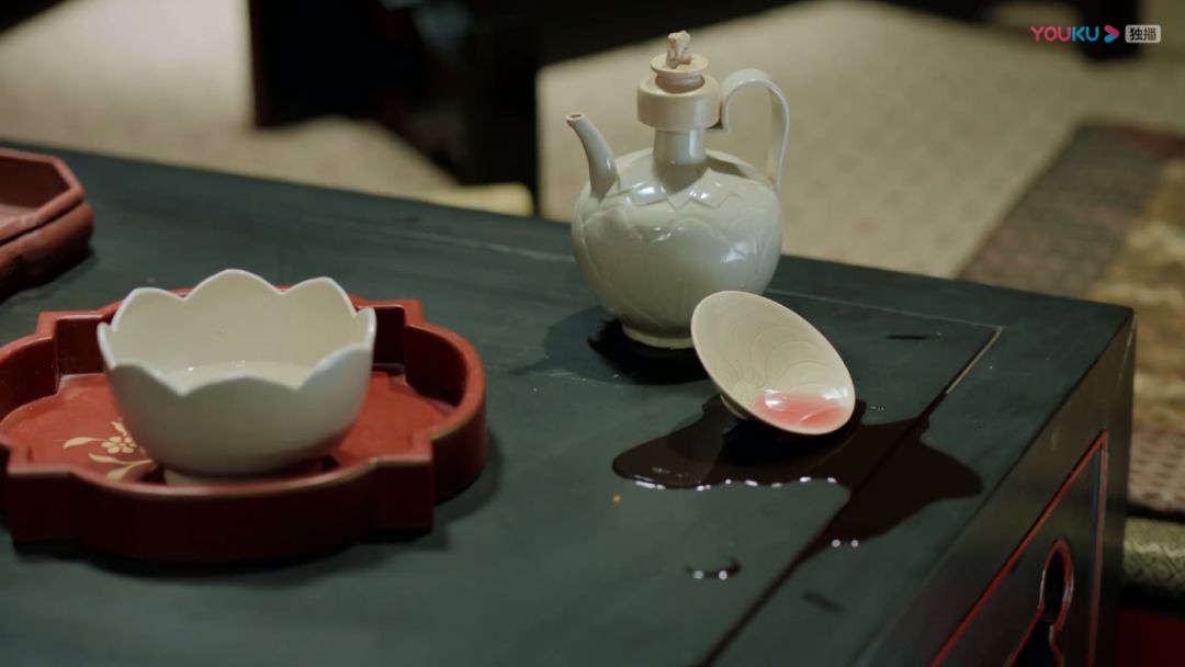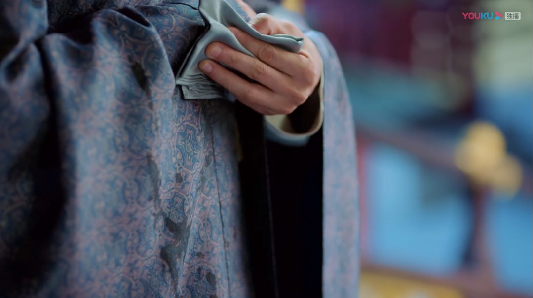 审问张内人一幕,咬舌自尽时,太子的衣袖上沾上了血迹,下一幕也不忘擦拭。