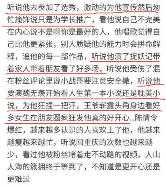 直到后来知道肖战去参加选秀了,这个女生激动的一直在为他宣传,他演的电影她带着家人朋友去支持,演的电视剧也在朋友圈为他疯狂宣传,虽然这份暗恋注定没有结局,但以粉丝的方式继续支持喜欢着他,也是一种欣慰和幸福。