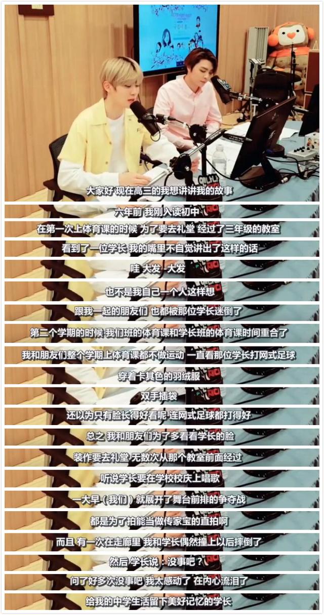 其实像这种暗恋的对象后来成了大明星的故事在娱乐圈赖冠霖不是个例,韩国男艺人郑在玹曾在一档电台节目里,也是读粉丝的来信,一个高三的女生6年前在读初中的时候,喜欢上了一个学长,她经常在学校里偷偷看他打网式足球,录他在校庆上唱歌的视频,还曾和他偶然撞上,他贴心的一直在问这个女生“没事吧”,后来这个男生以NCT男团的成员身份出道了。