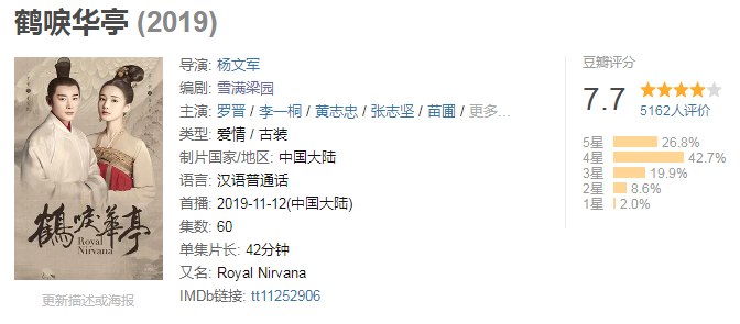 目前,《鹤唳华亭》豆瓣开分7.7 ,成绩虽不惊艳,但也差强人意。