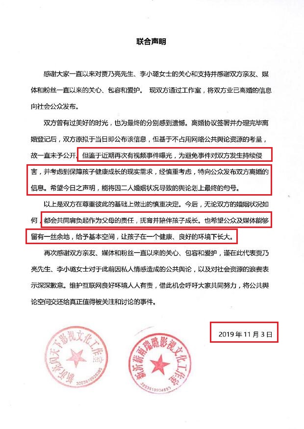 先来看下此次两人共同发出离婚声明中的一些细节,声明中提到近期曝出的视频是此次发出离婚声明的原因,不过更多的内容则是提到关于甜馨的成长,至于落款日期则是11月3日。