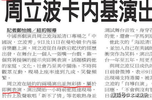 然而更厉害的还在后头,周立波卡内基演出结束后,被当地华人报社进行了详细的报道,称演出现场上座率高达九成,全场笑声频繁非常热闹。同时,还特意强调周立波两场演出都没有事先彩排,全靠提纲提示完成即兴表演。据悉,现场观众有不少是在美老华侨,纷纷表示出对周立波的喜爱与,并大赞他的海派清口是促进中美文化交流的桥梁。