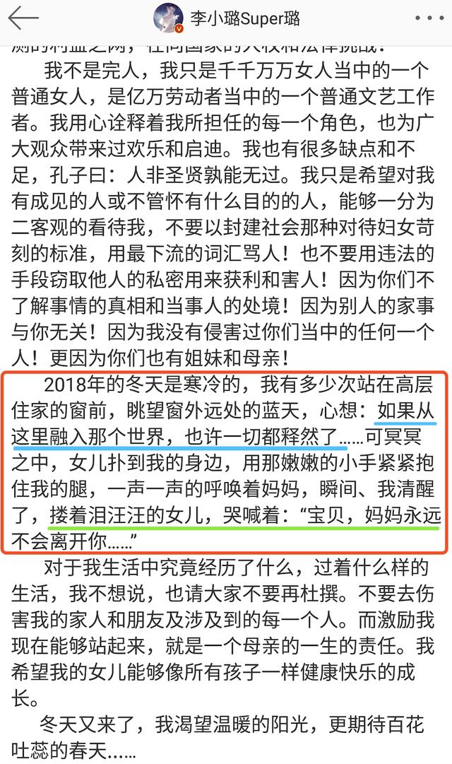 原标题:李小璐发文自曝被视频偷拍者威胁,曾想自杀解脱,因甜馨而