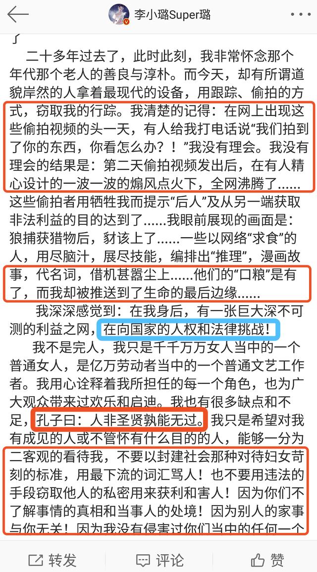 11月15日深夜,李小璐个人账号发长文回应。字数约为2300左右,汉字内容博大精深,李小璐扯了很多以前的事,利用“真挚”“真诚”“委屈”的语气向我们传达出自己的无辜,无助以及天大的委屈。