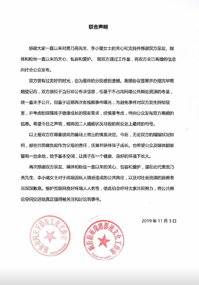 11月14日晚,贾乃亮工作室和李小璐工作室发布了联合声明,将双方业已离婚的信息向社会发布。不想占用公共资源一直未予公开,同时为了因为视频事件影响孩子的成长健康才官宣此信息。联合说明说的很客气,声明表示希望关于二人婚姻状况的舆论划上最终的句号。